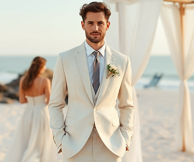 Heller Leinen-Anzug in Beige – ideal für Strandhochzeiten und sommerliche Gartenfeste mit entspannter Atmosphäre.