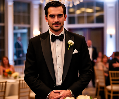 Klassischer schwarzer Smoking mit Seidenfliege – die ultimative Wahl für die glamouröse Abendhochzeit.