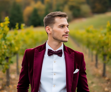 Bordeauxrotes Samt-Sakko mit anthrazitfarbener Hose – außergewöhnlich für die Herbsthochzeit im Weingut.