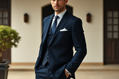 Marineblaues Drei-Teiler mit Weste – zeitlose Eleganz für die traditionelle Hochzeit im Garten oder Schloss.